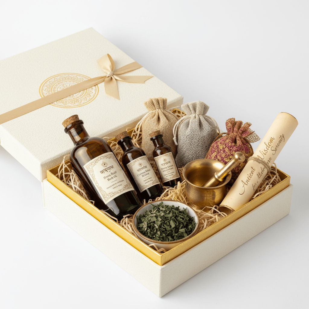 深いリラクゼーションを求める方へのプレミアムギフトセットです。マッサージオイル、トゥルシーティー、アシュワガンダパウダーの3点で、ストレスケアと睡眠サポートを提供します。